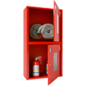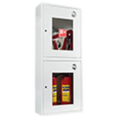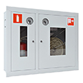 Шкаф пожарный позволяет разместить две рукавные корзины для двух пожарных рукавов в верхней секции, и два огнетушителя массой до 20 кг в нижней секции