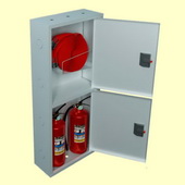 Шкаф пожарный имеет две вертикальные секции. Верхняя служит для размещения клапана, рукавной кассеты, рукава и ствола, а нижняя для двух огнетушителей